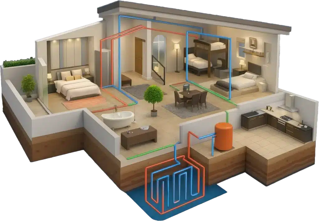 Es un sistema que aprovecha la temperatura constante del subsuelo para generar calefacción, refrigeración y agua caliente de forma sostenible.